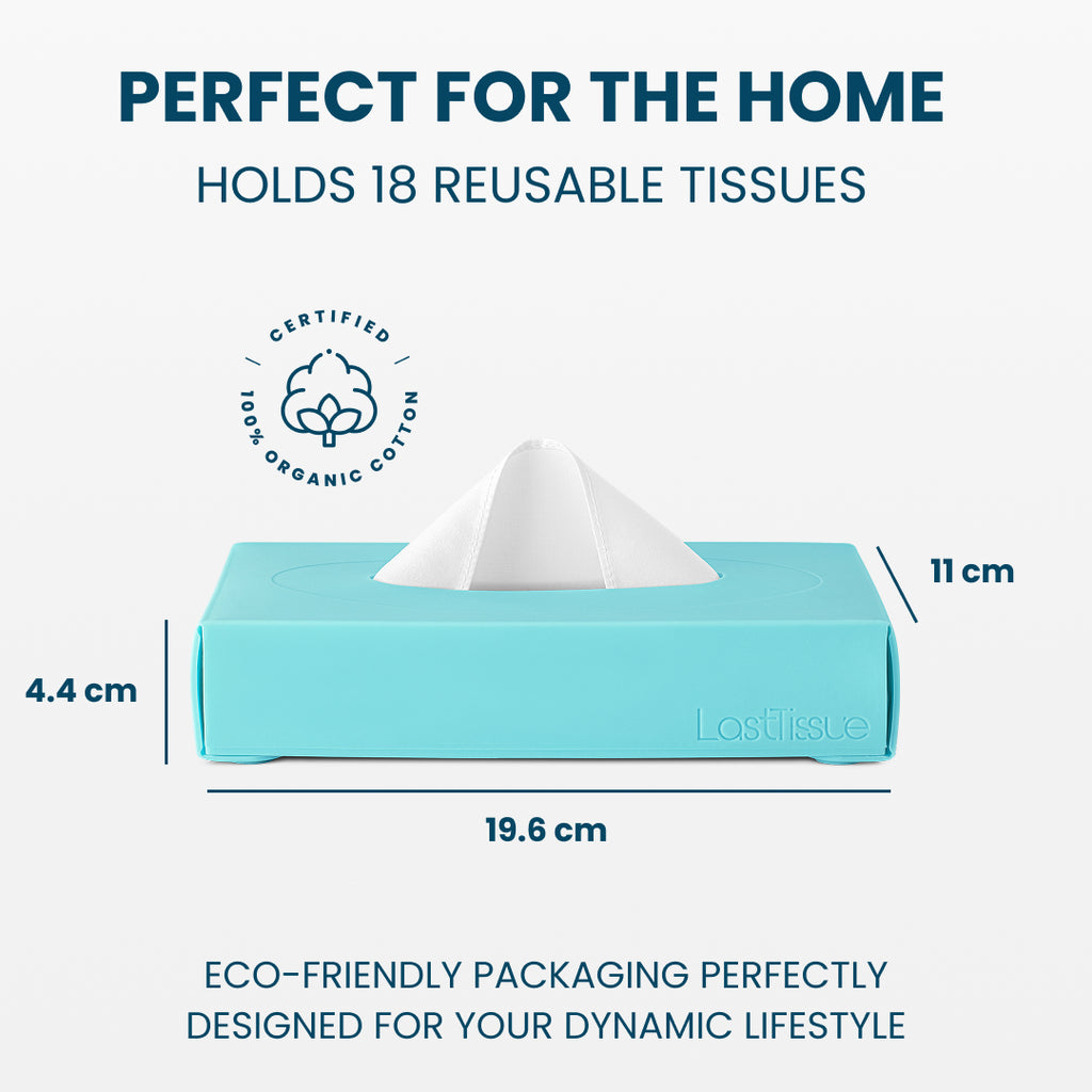 The eco-friendly and practical solution to your family's tissue needs. This kit includes 4x Food-Grade Silicone Boxes, each containing 18x Reusable Organic Cotton Tissues. One LastTissue Box replaces +9100 single-use tissues.