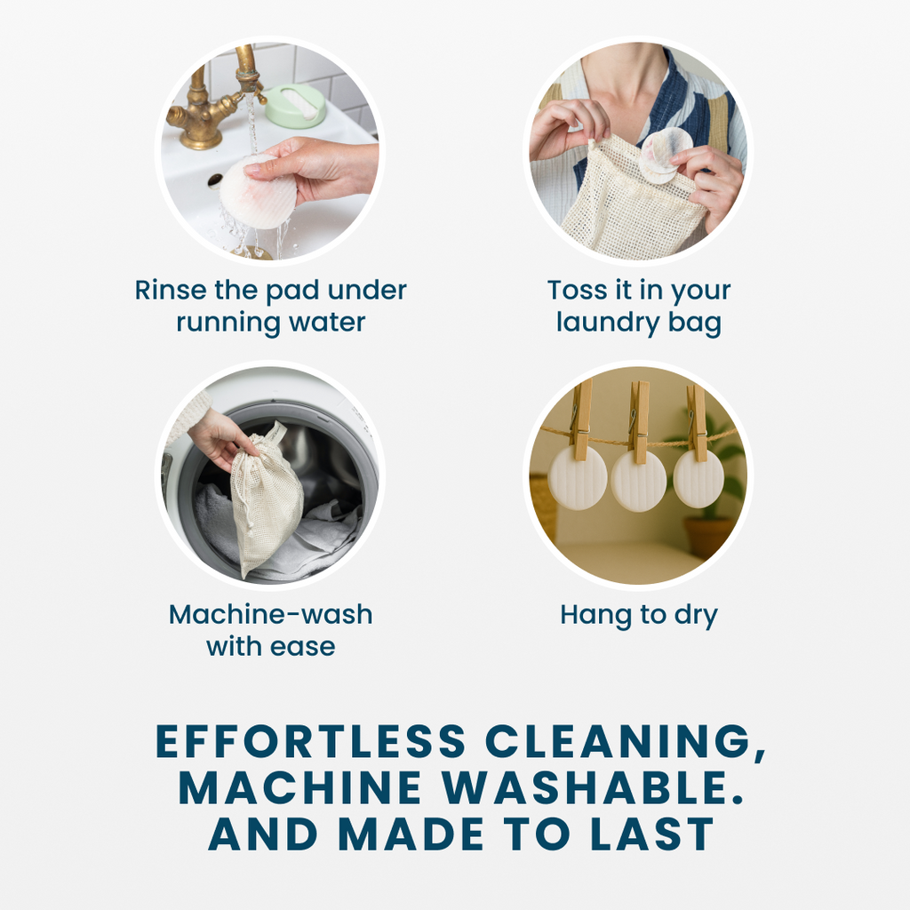 Du kan tvätta dina rundor för hand efter varje användning. Tillsätt bara lite tvål och vatten och låt det torka platt. Du kan också tvätta i maskin (86°F/30°C är bäst för miljön, men 140°F/60°C är också okej). För att hålla dem säkra och sunda rekommenderar vi att du använder en tvättväska.