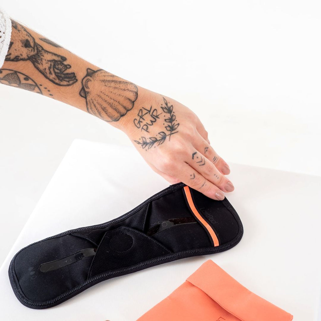 Först och främst, ta ut LastPad ur bärpåsen och fäst den på dina trosor. Om du precis har tvättat din pad, se till att silikonremmarna inte har något ludd eller ludd. Fäst kardborren.